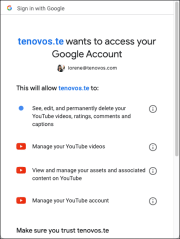 Accept the access settings. A message “Successfully connected to YouTube” is displayed and the channel is added to the Admin > Content > Publishing list.