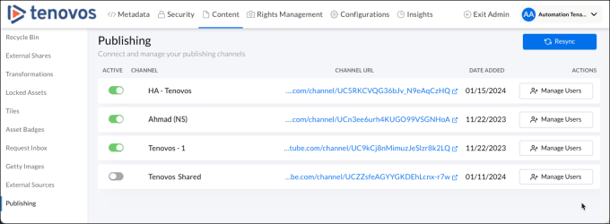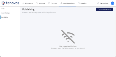 In Admin > Content > Publishing, use Connect Account/Resync to authorize Tenovos access to a specific YouTube account and its associated channel(s). The ability to connect Tenovos to YouTube requires the Channel Admin privilege.
