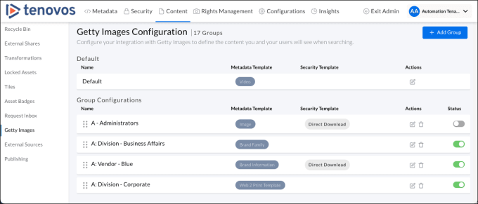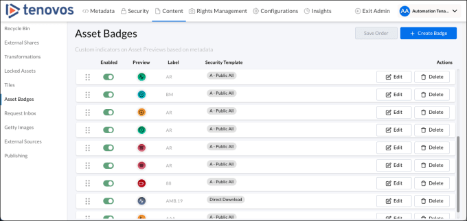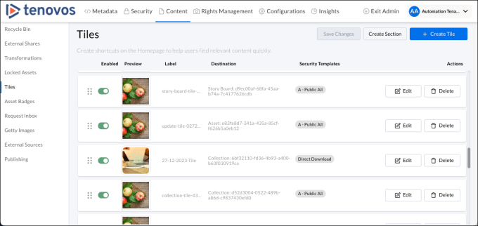 In Admin, the Content tab allows you to permanently delete or restore assets and shared links, and manage a variety of content options that are presented to users including Tiles, Asset Badges, and External Sources.