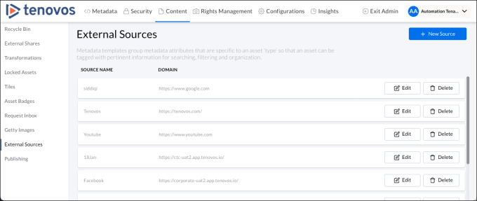 In Admin > Content > External Sources, locate the source you want to edit and click Edit.