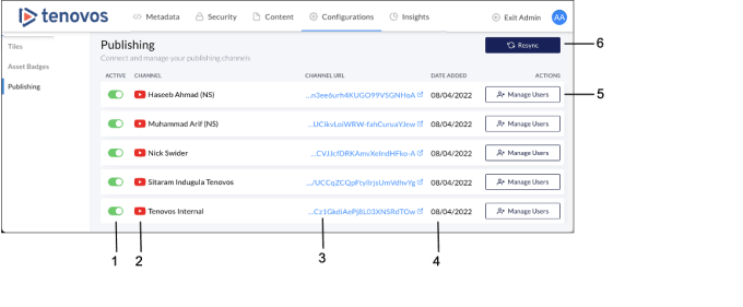 (6) Connect Account/Resync. Connect or resync YouTube channels with Tenovos.