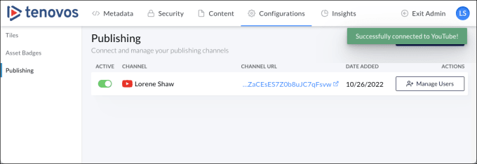 C. Message “Successfully connected to YouTube” is displayed and the new Tenovos channel(s) are added to the Content > Publishing list.