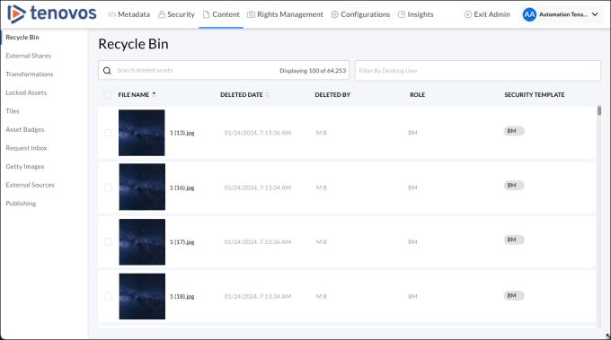 In Admin > Content, the Recycle Bin page allows administrators to review deleted assets and permanently delete them or restore them to the Content gallery. Assets in the Recycle Bin are not accessible from the Content gallery.