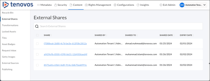 In Admin > Content, the External Shares page is where administrators manage the download links to externally shared ZIP files. These links and ZIP files are generated when users share assets via the Share or Transformations options.