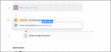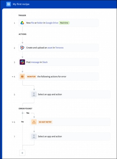 Now that we have the Handle errors action in our recipe, let’s add our Create and upload an asset to Tenovos and Post message in Slack actions to our monitor block.