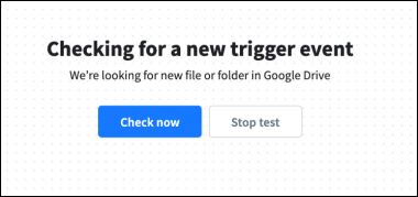 When you choose to Test Recipe, the recipe will check for a new trigger event. For this recipe, if it doesn’t find a new file in Google Drive, the recipe will continue to wait until it finds one—or until you choose to Cancel job, Stop test or Exit.