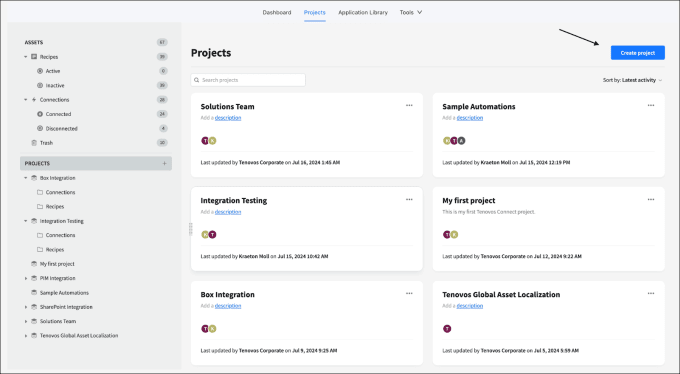- In the Projects screen, click Create project. This project is where you’ll create and save your connections and cecipes.