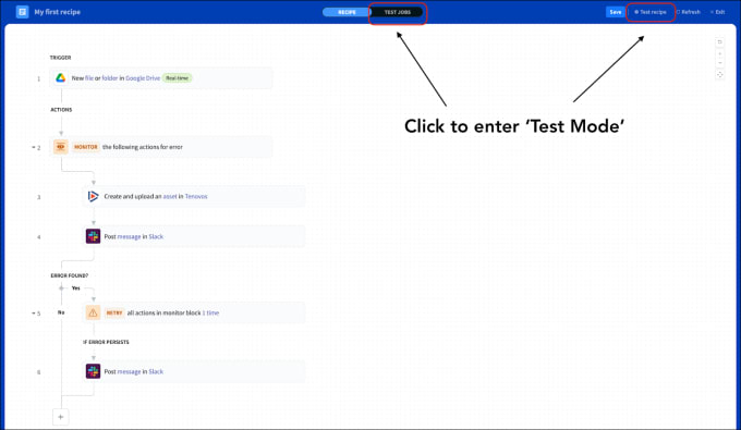 Testing a recipe. The Tenovos Connect recipe test mode ensures your recipe’s behavior and data processing are correct. In test mode, the recipe will check for a new Trigger event, but will only process the first job received. This allows you to review the functionality of your recipe without consuming more tasks than necessary. Upon completion, the test job is logged in the recipe’s job history where its details are available for your review.
