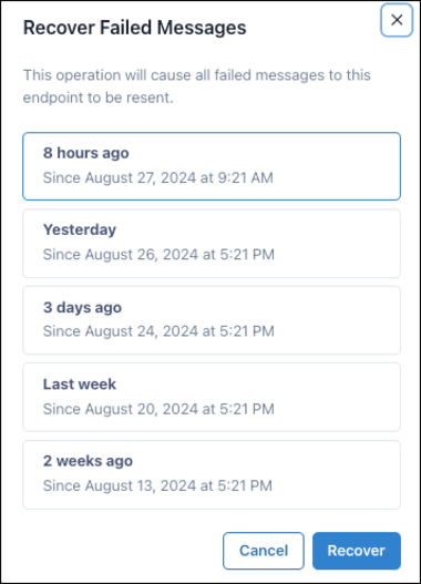 NOTE: To resend all failed message attempts for a specific endpoint since a given time, open its details screen and select Recover failed messages on the page options menu.
