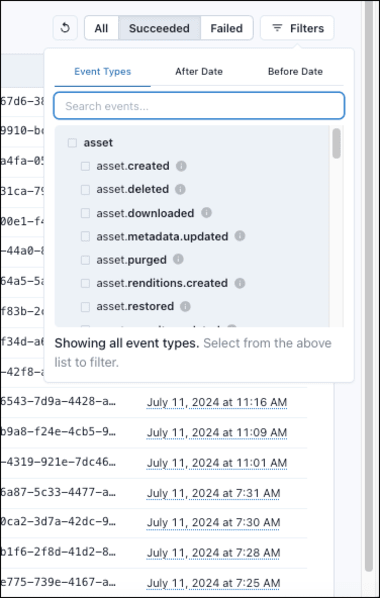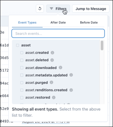 In Tenovos Webhooks > Logs, you can filter the Latest Messages list by event type and by date. If you know approximately when the message was sent, use the After Date or Before Date options to further narrow down the list.