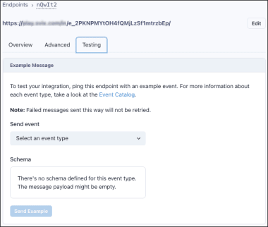 You can test an endpoint and its events via the Testing tab in its details page. The Send Example option on this tab allows you to send example events. This returns a message that you can open to view the event payload, review all message attempts, and see if it succeeded or failed.