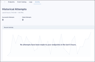 The Tenovos Webhooks Activity page provides a visual representation of the last 6 hours of notification activity, including the count of successful and failed delivery attempts, across all endpoints. Tenovos informs you if “No attempts have been made to your endpoints in the last 6 hours.”