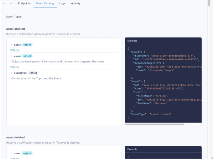 The Tenovos Webhooks Event Catalog lists all the event types that are available for subscription by endpoints. For each event type, you can view a description of the event, the structure of the event payload, the values you can expect to receive, and an example payload.