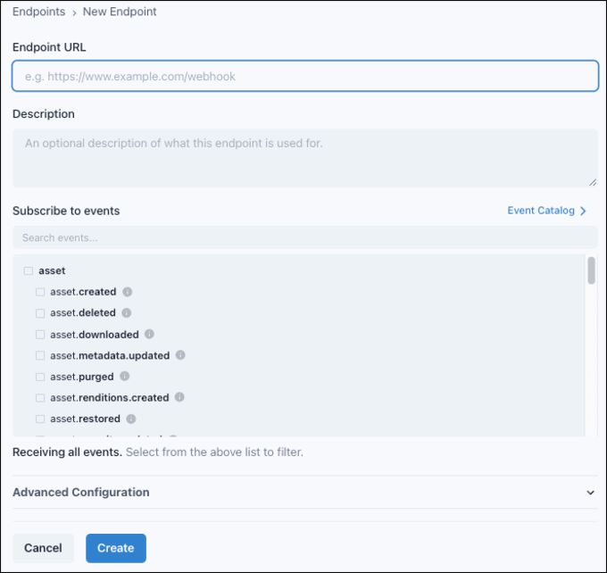 Adding an endpoint is easy—just provide a URL that you control, select the event types that you want to receive notifications about, and click Create.