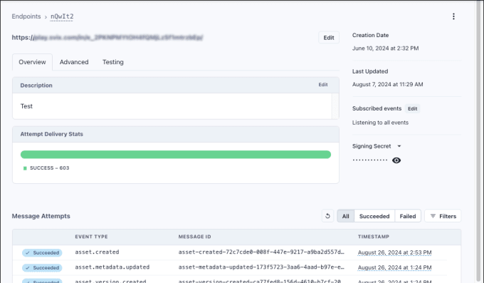 The easiest way to boost your confidence in your endpoint configuration is to begin receiving event notifications as soon as possible. In the endpoint details screen, the Testing tab allows you to send example events to your endpoint. After you Send Example, you can click the message to view its contents (the event payload), review all its message attempts, and see if it succeeded or failed.