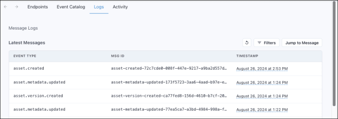 The details page for an individual endpoint displays information about its message attempts. This includes if it succeeded or failed, the message’s event type, ID, and timestamp. Clicking an individual message opens additional information in the Logs page including the message content.