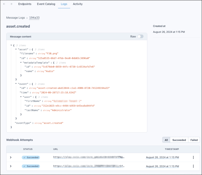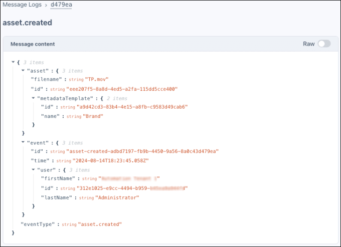 Message details in Tenovos Webhooks > Logs:
