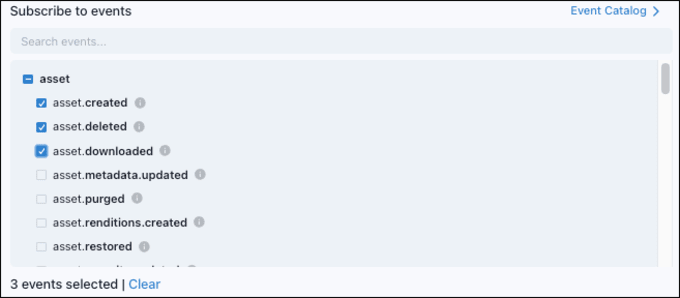 Events describe the type of action that was performed within your Tenovos account, such as Create, Update, Download, Share, and Delete. When you add an endpoint, you provide a URL that you control and select the event types that you want to receive notifications about. When any of the subscribed events occurs, Tenovos will send a message to the endpoint URL.