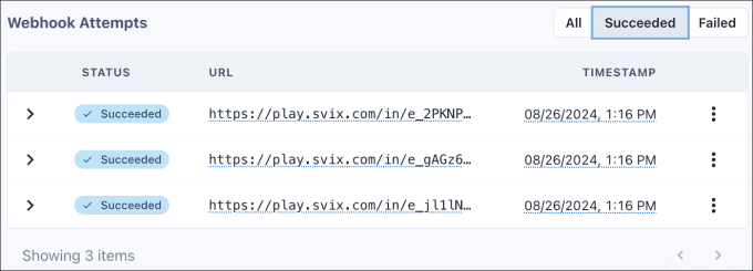 Scroll down to the Webhook Attempts section to view a list of all delivery attempts.