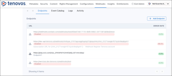 - Endpoints page. Add, edit and manage the endpoints receiving event notifications from Tenovos.