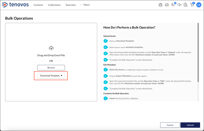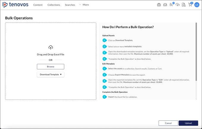 Users with the Bulk Operations privilege can use a metadata template to submit multiple assets for validation and upload to Tenovos.