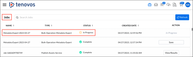 Track the progress of the metadata export request in the Jobs center.