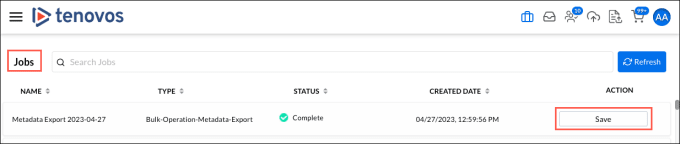 In the Jobs center, locate your completed metadata export job and click Save to download the Excel file.IMAGE: Jobs center, Save button
