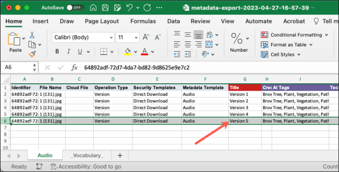 Open the downloaded metadata export file, set the Operation Type to “Version”, enter the required information for each new version, then save the file.If you are creating multiple versions of an asset, Tenovos creates versions in the order listed. The asset at the bottom of the list will be the current version. In the following screenshot, “Version 5” will be the current version.