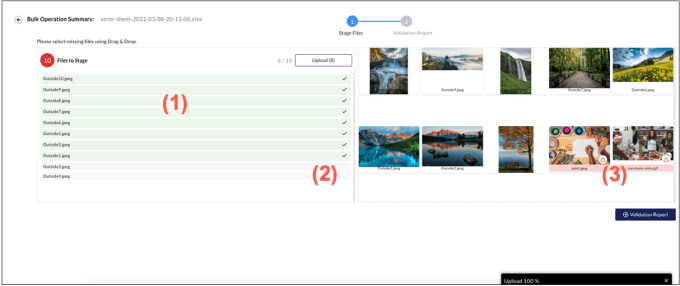 - Assets that match the file names in the Excel validation file are highlighted in green and marked with a checkmark (1 in the following screenshot) .