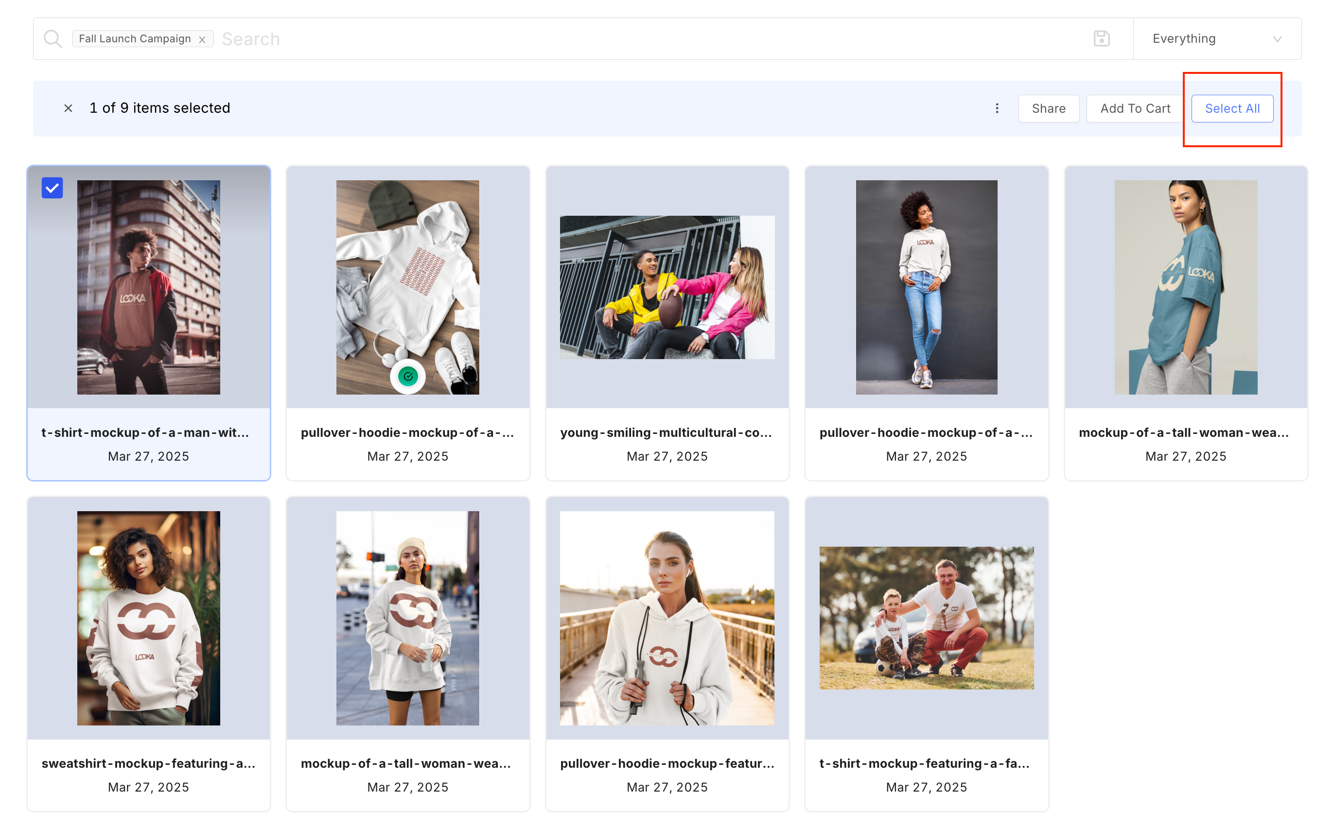 You can add a collection of assets to the Cart for future actions. When there are assets in the Cart, a number on the Cart icon displays the asset count.