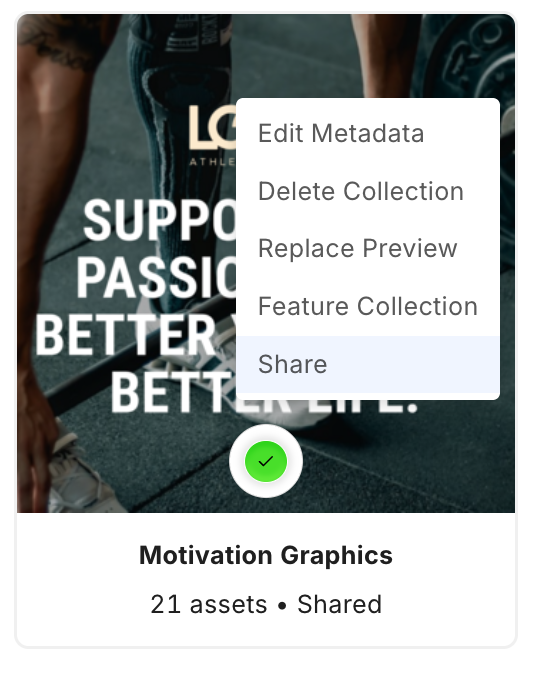 You can share links to collections and their assets with internal users—users with credentials to the system. For Shared collections, you can send a link to a specific collection or selected assets in that collection. For Private collections, you can send a link to assets you select in that collection.