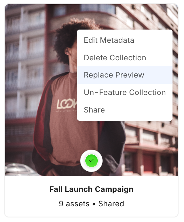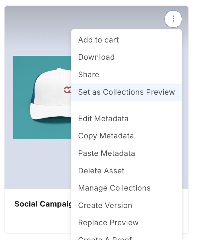 Navigate to the asset that you would like to use as the collection preview. Click Set as Collection Preview. If you do not see this menu option, you do not have the required permissions for the collection.