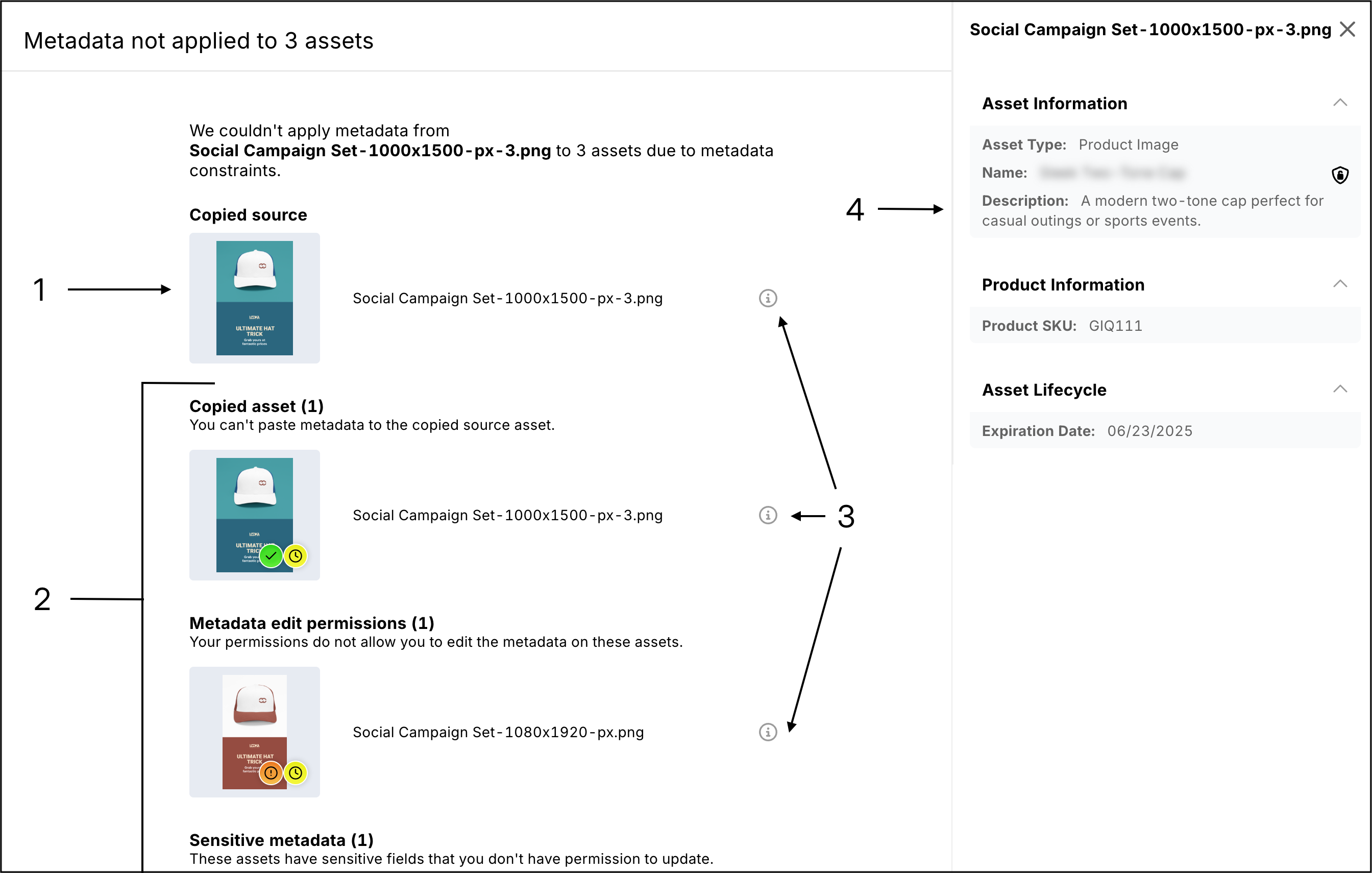 - Limit Asset Selection to 200 or less: To ensure performance and accuracy, limit the number of assets selected for metadata pasting to 200 at a time. If you attempt to paste to more than 200 assets at once, you will be asked to reduce your selection before proceeding.