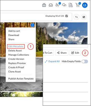 You can edit the metadata of a single asset from the Cart, Content gallery (1), or Asset Details (2).