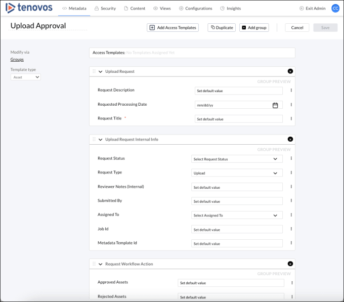 IMPORTANT: The required system-controlled metadata groups should not be modified. However, you can edit the metadata group Upload Request Internal Info to set the default value of Request Type to "Upload."