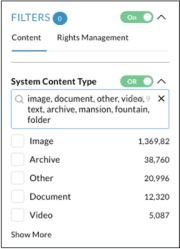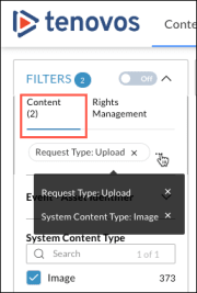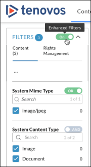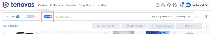 By default, Tenovos completes a boolean AND search for the filters you select—the search results are filtered to include only the assets with all the attributes you select.