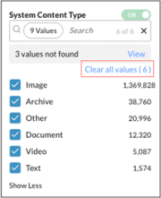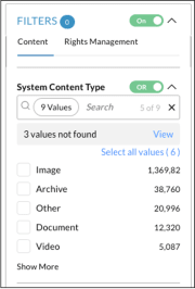 With Enhanced Filters on, you can use a filter category’s search field to quickly search for facets. To search for facets, type or paste a list of values separated by commas into a category’s search box. Tenovos displays the total number of values that were entered, the total values not found, and an option to select all found values. Clicking Select all values initiates a search for the available values.