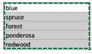 Keywords copied and pasted from a multi-column table to the Tenovos search bar are entered row by row. For example, the words “blue spruce,” “ponderosa,” and “beech” from columns A, B, and C of row 1 in the following table are listed first in the search bar.