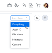In the Content gallery, the Tenovos search bar includes the option to conduct a targeted search. This allows you to add even more granularity by searching against specific data including Everything, Asset ID, File Name, Metadata, and Content.