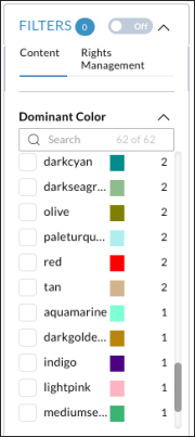 The Dominant Color filter allows you to search for assets based on dominant color. The filter includes color names and a swatch for each color.