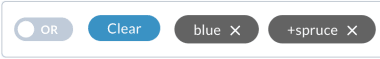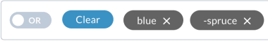 OR. Searches for any of the terms. For example, the following is a search for assets that include the search criteria of “blue” OR “spruce”.