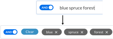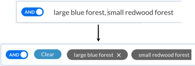 Multiple words that are comma-separated are treated as phrases. For example, entering large blue forest, small redwood forest in the Search Assets bar results in two search pills.