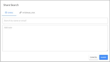 To share via email, display the Email tab and use the Search by name or email field to locate and select the recipient accounts. Enter an optional note in the Add note text box, then click Share.
