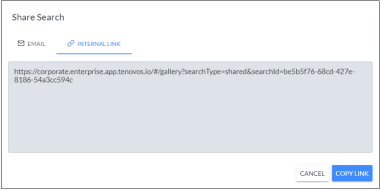 To share via an internal link, display the Internal Link tab and click Copy Link. Paste the link into your preferred distribution channel such as your organization’s messaging app. Users who click the link must log into Tenovos before they can view the results of the saved search.