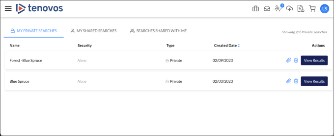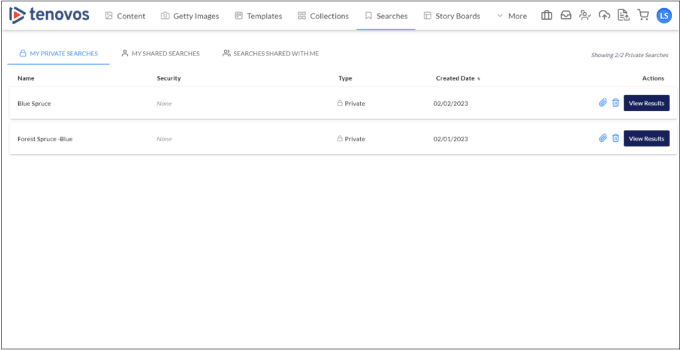 - In Private Searches, the Actions column includes the options Copy link to clipboard, Delete search, and View Results.
