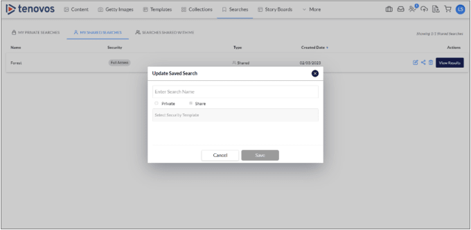 Saved searches allow you to store and quickly access frequently used search parameters within Tenovos, saving you from having to repeatedly enter the same search criteria. The results of a saved search depend on your user permissions and the assets available in the system, so they may update as new content is added or removed. You can create as many saved searches as needed—there is no limit.