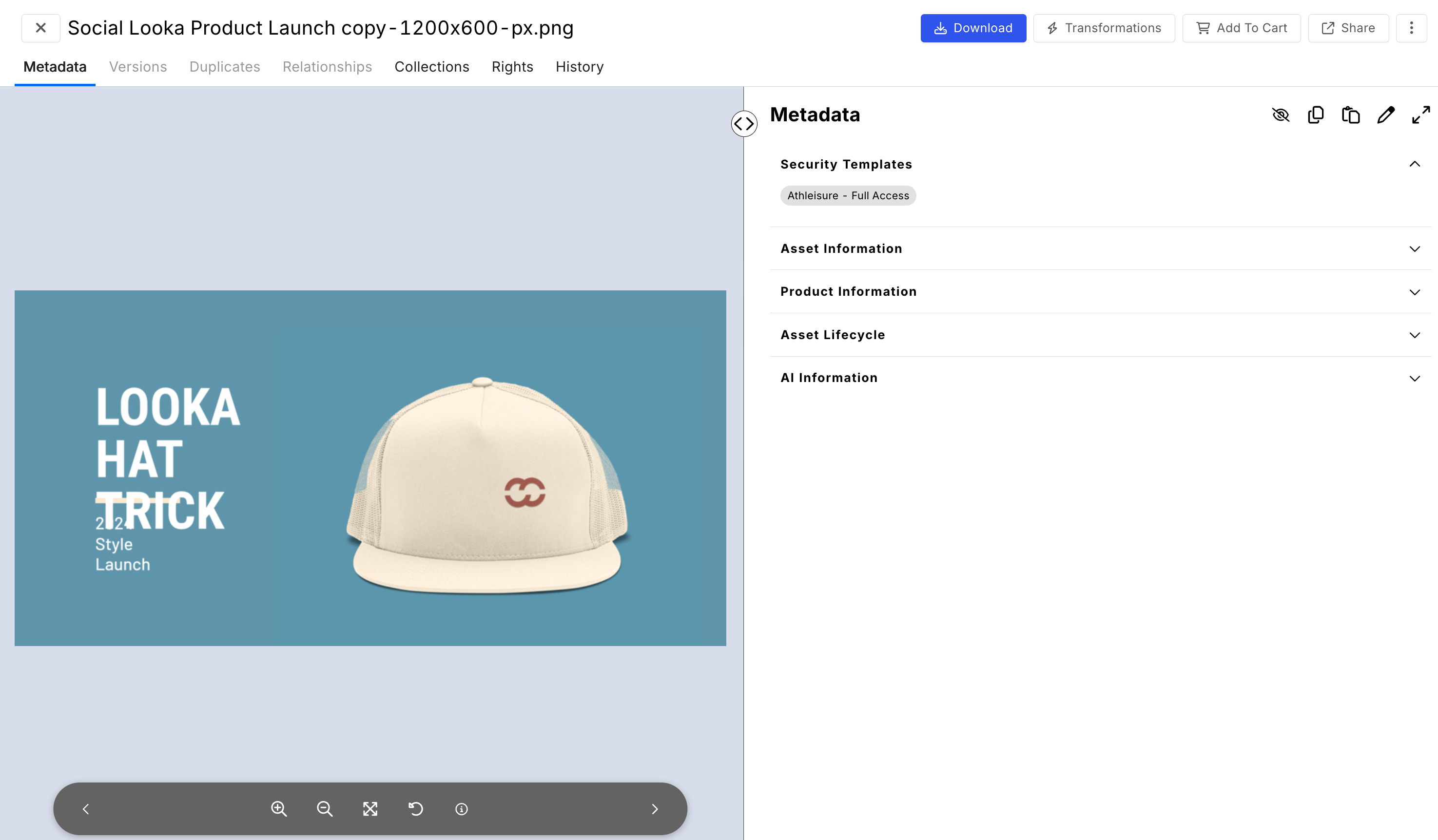 The Asset Details page provides a comprehensive view of any asset in Tenovos. The Tenovos asset details page allows you to easily explore the asset's metadata, versions, relationships, duplicates, related collections and event history in one central location. This page features a larger preview of the asset, alongside details such as the file name/title, metadata, and the applied security templates. Additionally, it offers a range of actions that you can perform, such as adding the asset to your cart, downloading, sharing, and creating transformations.