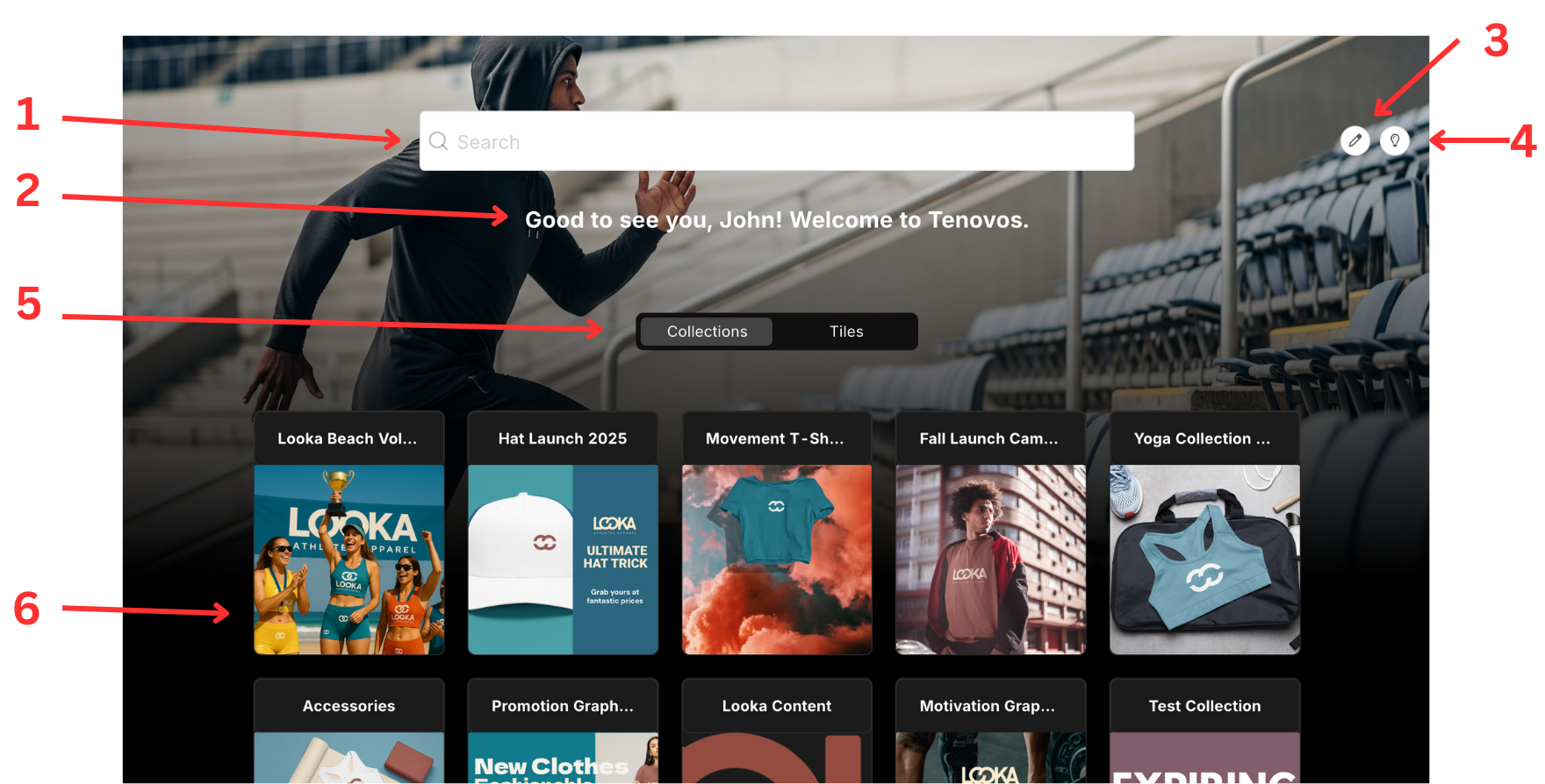 (5) Collection/Tile Toggle Switch. This toggle allows the user to easily switch between viewing Featured Collections and Tiles. The labels for Collections and Tiles can be customized in the Configurations > Branding page. The default content view can be configured on the Configurations > Page Layout page.