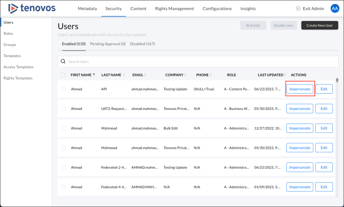 Tenovos introduces the ability to impersonate other user accounts. This feature is available to customers participating in the Beta release of this feature and will be available to all customers in the next few weeks, or sooner.