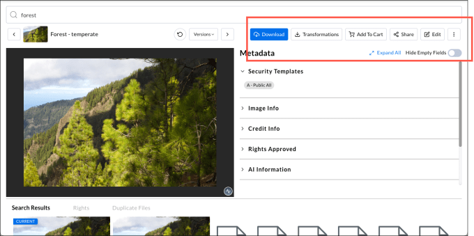 • Action buttons have been moved from the right side of the metadata panel to the task bar above it. This update creates more space for viewing metadata.